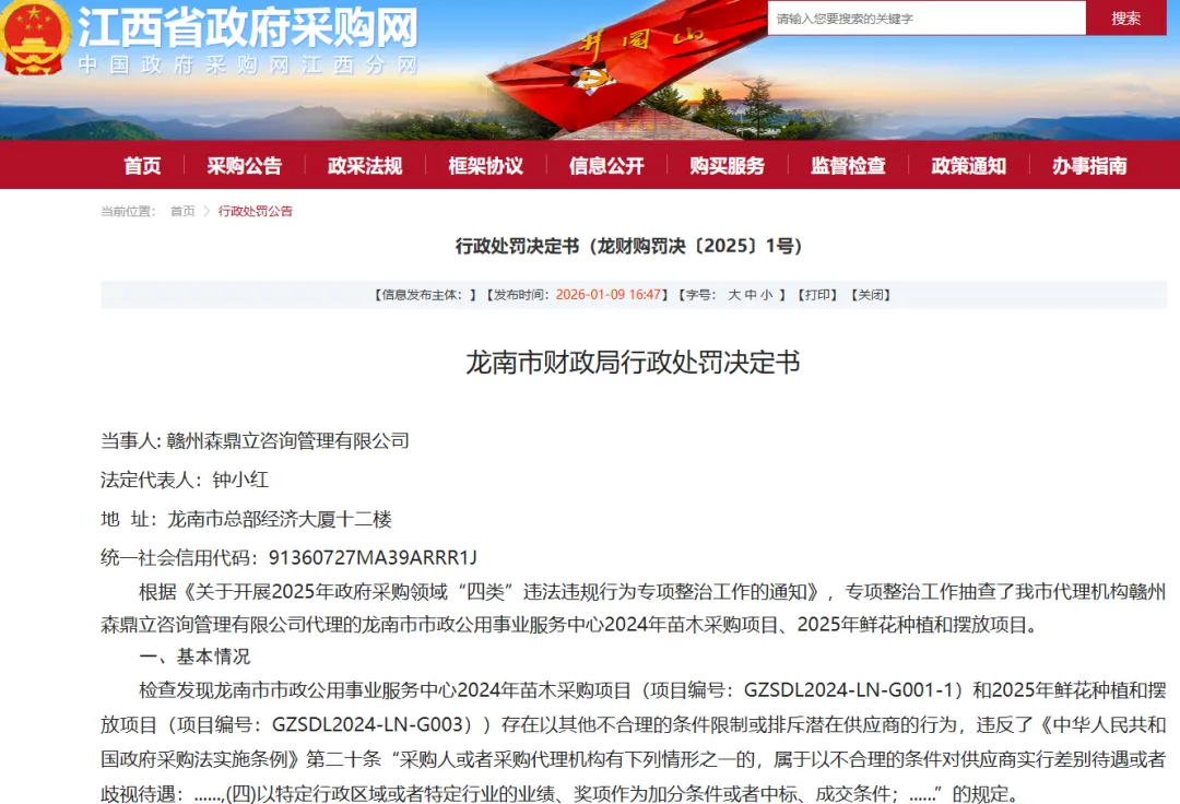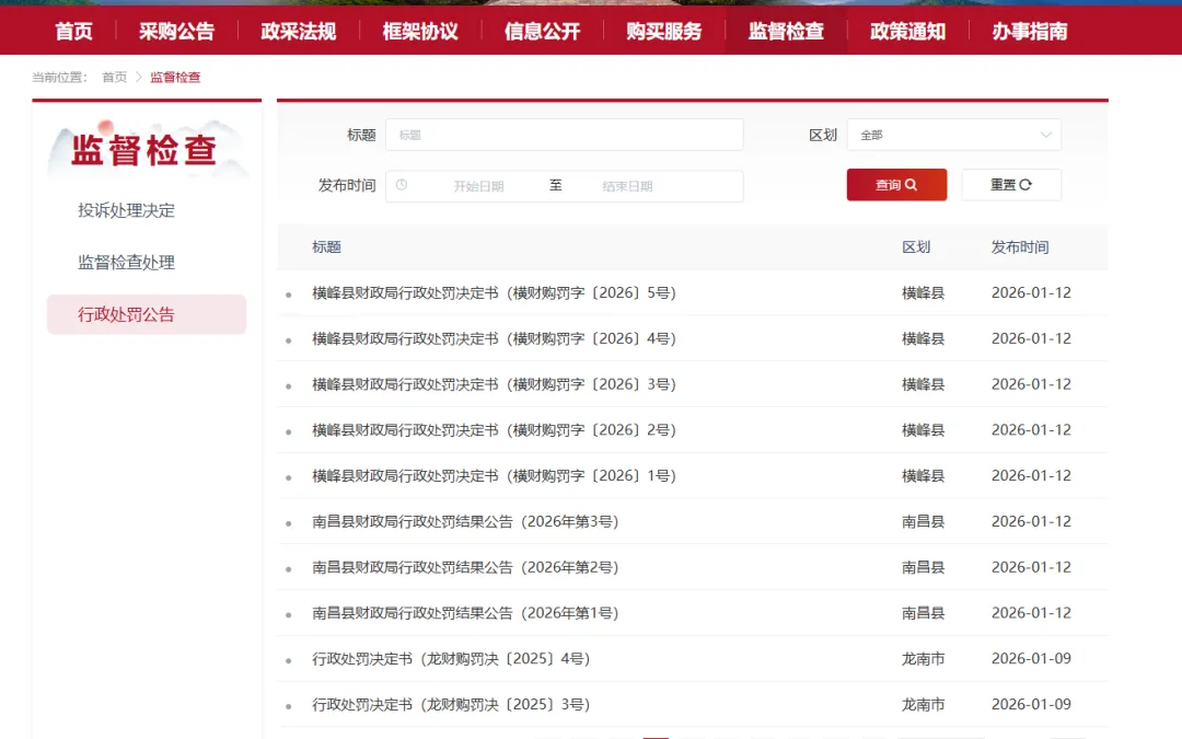 2026年初江西省政府采购监管力度显著加强,释放了“全链条严查”的强烈信号。在江西省政府采购网发布多则财政局行政处罚结果公告,引发广泛关注。其中处罚对象有供应商、招标代理公司,也有不少采购人单位比如事业单位、政府部门等。