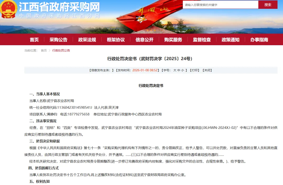 2026年初的这一波公告中,出现了针对这些单位的行政处罚或通报批评,这在政府采购监管史上具有极强的标志性意义,说明江西省的监管风向发生了深刻变化。