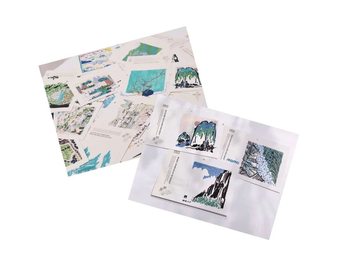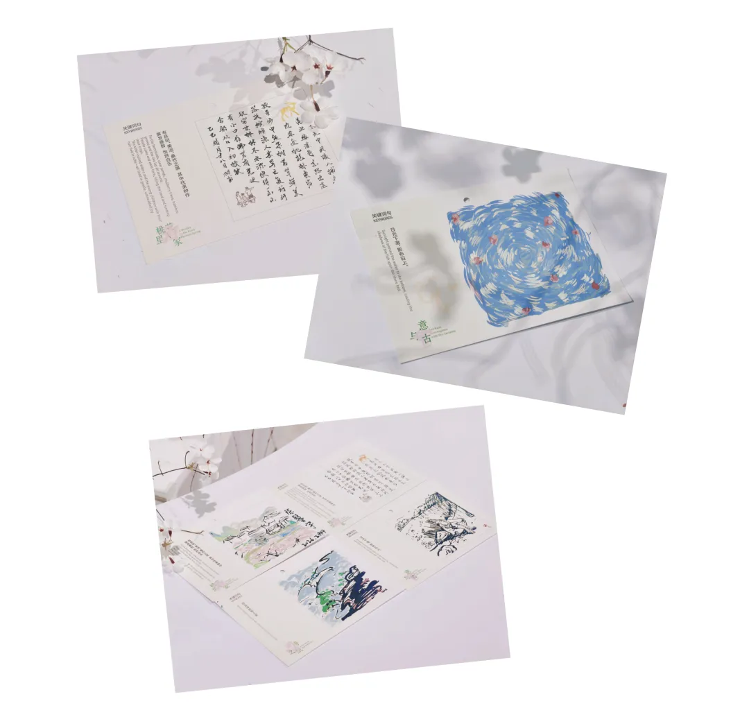 互动区设置了4款桃源限定诗歌盲盒,邀请观众随意抽取创作,把诗画下来,落笔即是桃源。由此,文字生长成风景,我们一起邂逅春风、山影、月色里的千年诗意。人人心中皆有桃源,人人皆可绘就桃源。