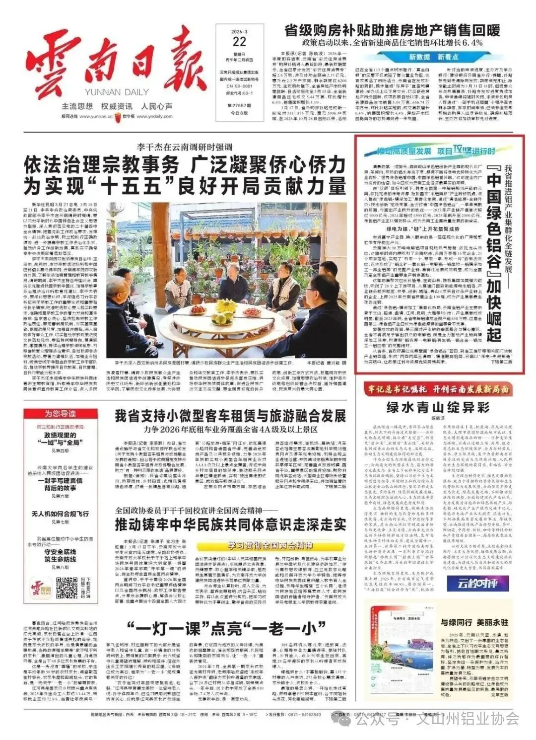 近日《云南日报》头版聚焦云南绿色铝产业发展,作为“中国绿色铝谷”核心区,文山州依托绿电优势抢抓“北铝南移”机遇,实现产业跨越式蝶变,2025年绿色铝产值突破千亿大关,成为全州首个千亿级产业集群,撑起全省铝产业半壁江山,从传统农业州成功跃升为工业强州。