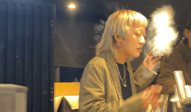 “框框”一头时髦的奶奶灰,唇环、耳环、项链、戒指,时而吞云吐雾,时而作为“卖酒的”,也会和酒客碰一下杯,然后,真的喝下一口。