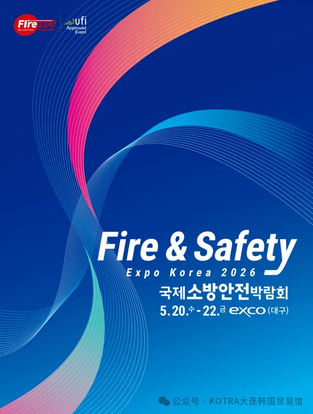 为进一步促进中韩两国在消防器材领域的经贸交流与合作,由韩国消防厅、大邱市/ EXCO、KOTRA等举办的2026国际消防安全博览会将在2026年5月20日~22日举办。KOTRA哈尔滨韩国贸易馆诚邀对韩国消防安全相关领域感兴趣的中国买家、企业赴韩参加线下商务洽谈。
