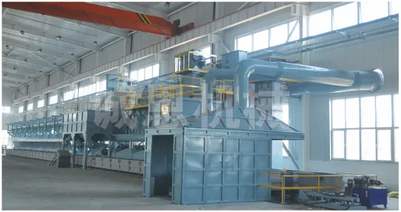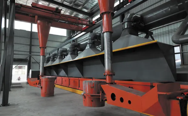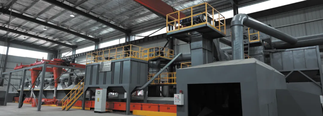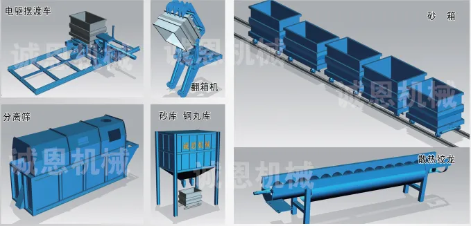 生产线大致分为五个部分:由砂箱,摆渡机构,推箱机构组成砂箱循环使用的基础功能;由翻箱机,落砂振动筛,落砂滚筒筛组成铸件分离功能;由分离筛,斗提机,绞龙、砂库、振实台,埋型砂冷却设备,废砂收集设备组成埋型砂的循环功能;由浇铸侧吸罩,冷却封闭罩,翻箱除尘罩,摆渡车封闭罩,除尘器,活性炭,风机组成生产线去尘、去味部分;使用定制铁水包转运小车、地轨式浇铸机、行车式浇铸机进行浇铸,缩短铁水转运时间,省人省力,操作方便灵活。