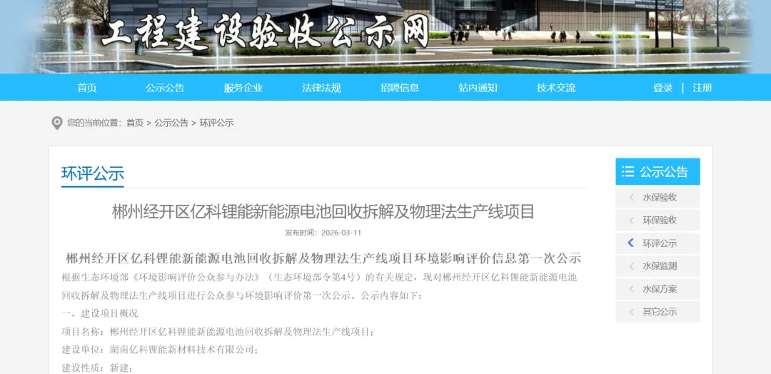 本次湖南亿科锂能新材料技术有限公司拟建的项目位于湖南郴州经济开发区,项目性质为新建,项目用地面积约 4163 平方米,将租赁湖南郴州经济开发区石盖塘片区已建的 2 栋生产厂房进行建设,项目将建成废旧锂电池拆解回收生产线 2 条,形成 5 万吨 / 年废旧动力锂电池资源循环利用生产能力,设计年处理废旧动力锂电池 5 万吨,同时配套建设相应的公辅工程及环保工程。作为聚焦废旧锂电池回收与锂资源循环利用的产业项目,其落地不仅将完善郴州市新能源循环经济产业链条,也将进一步提升区域在废旧动力电池回收利用细分领域的产业竞争力,为区域新能源产业闭环发展注入新的动能。
