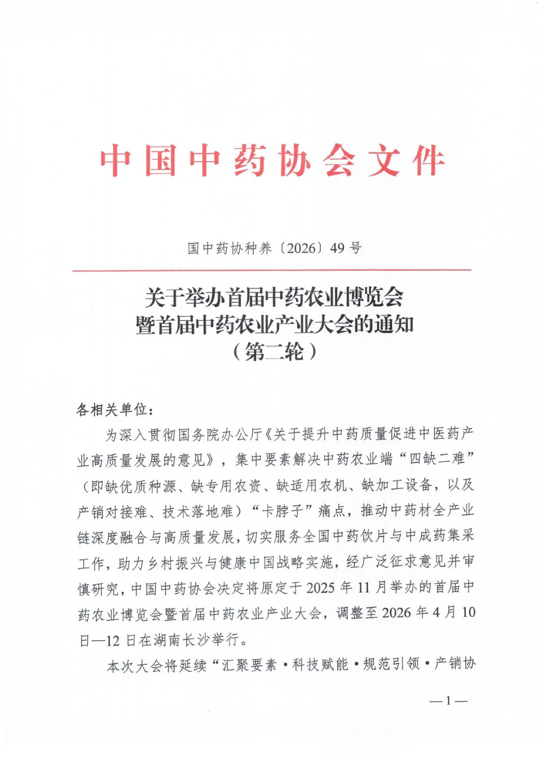 为深入贯彻国务院办公厅《关于提升中药质量促进中医药产业高质量发展的意见》,集中要素解决中药农业端"四缺二难"卡脖子痛点,推动中药材基地与工业企业直接对接与品牌化发展,切实服务全国中药饮片与中成药集采工作,助力乡村振兴与健康中国战略实施,经广泛征求意见并审慎研究,中国中药协会决定将首届中药农业博览会暨首届中药农业产业大会定于2026年4月10日-12日在湖南长沙举行。