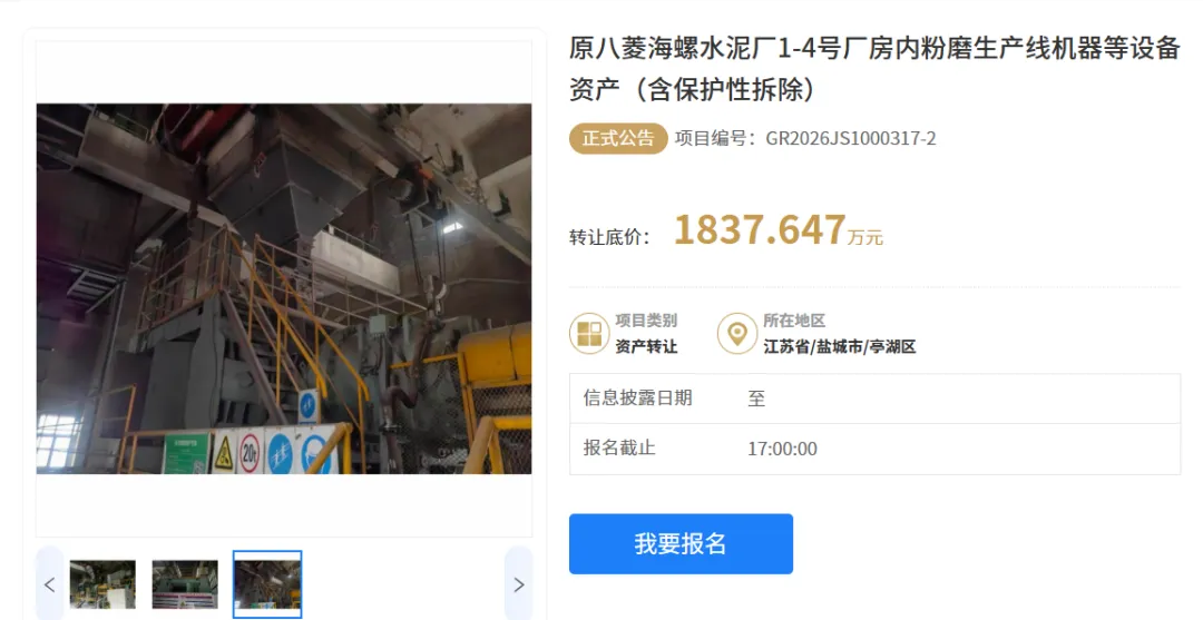 近日,原八菱海螺水泥厂1-4号厂房内粉磨生产线机器等设备资产正式在江苏产权交易所平台挂牌转让,转让底价为1837.647万元。该项目标的主要为一批已拆除的机器设备,披露期为2026年3月23日至3月30日。
