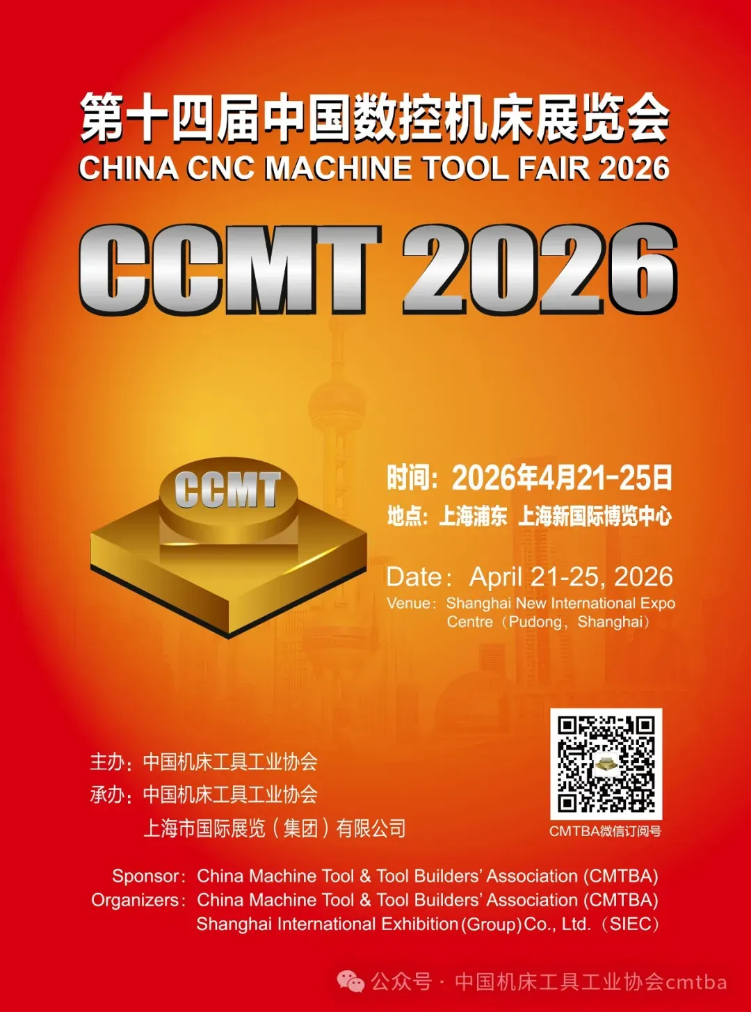 第十四届中国数控机床展览会(CCMT2026)由中国机床工具工业协会主办,并与上海市国际展览(集团)有限公司共同承办,将于2026年4月21-25日在上海浦东•上海新国际博览中心举办。