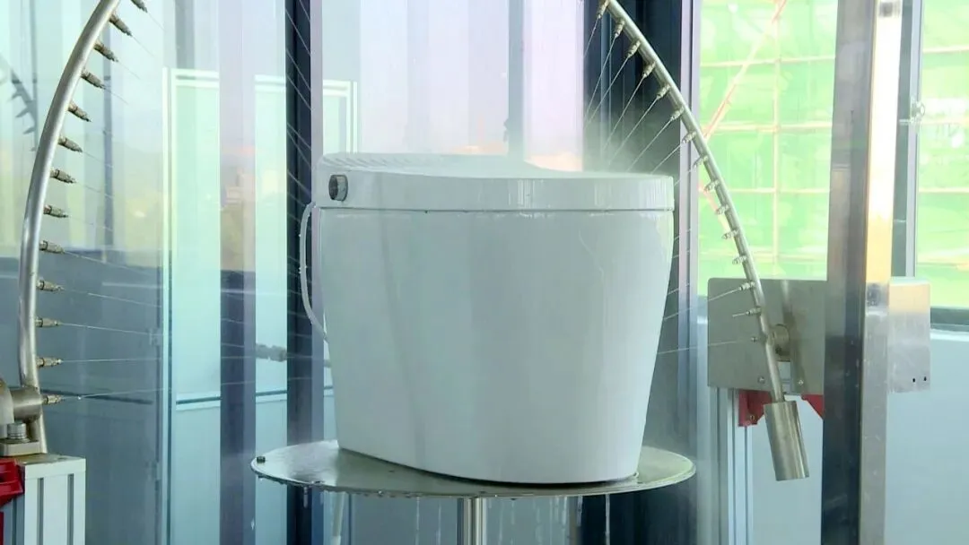 在智家优品卫浴公司的展厅里,摆放着企业最新研发的智能卫浴产品。这款轻智能坐便器,具备泡沫盾、自动翻圈、除臭等功能,专为酒店等公共场所设计。
