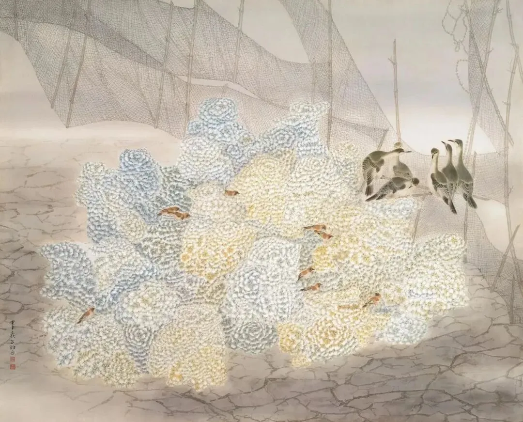 苏百钧先生擅以日常朴素之景入画,赋予画面诗性意境,跳出传统工笔花鸟的程式窠臼;同时,他于传统勾勒法度之中,营造浪漫格调,彰显中国美术独有的写意精神。其艺术既承续宋人花鸟画精细不苟的格物之心,又以借物抒情的东方意蕴,作出极具感染力的现代诠释。