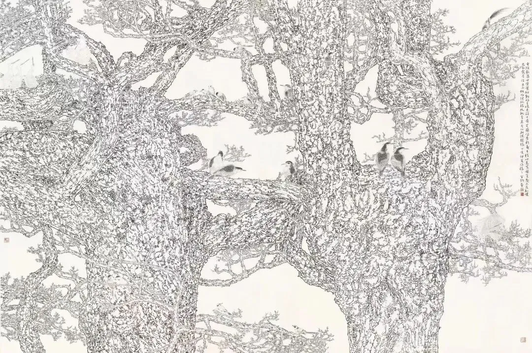 ◎ 《高秋集禽图》200×300cm,纸本,2007年