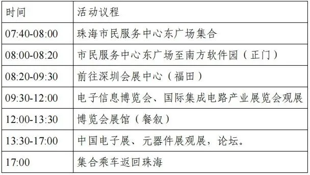 (一)本次活动不收取任何费用,由协会统一安排车辆接送和用餐,上车点为珠海市民服务中心东广场或南方软件园正门,具体行程详见行程安排。