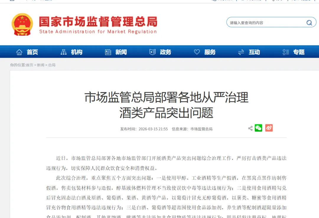 3・15 国际消费者权益日刚过,酒类市场就迎来了全国范围的重磅监管!近日,市场监管总局正式发布部署,在全国开展酒类产品突出问题综合治理工作,全链条严打酒类违法违规行为,从生产加工、食品销售、餐饮服务到宣传营销,实现监管无死角,切实守护老百姓的饮酒安全与消费权益。今天这篇文章,将从出台背景、核心条款拆解、监管新特征、行业与消费端影响四个维度,对文件进行全面深度解析。