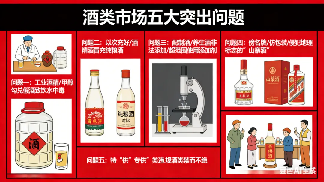 本次综合治理精准锁定五大类突出问题,每一项都对应酒类行业的核心痛点,明确了执法监管的核心标尺,具体拆解如下: