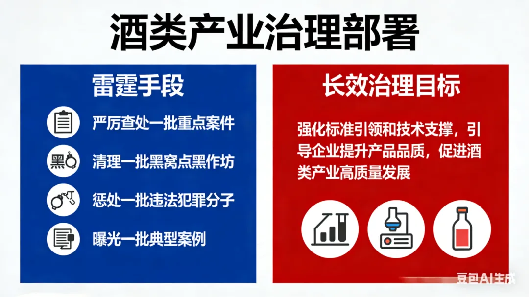 本次部署既有 “严厉查处一批重点案件、清理一批黑窝点黑作坊、惩处一批违法犯罪分子、曝光一批典型案例” 的雷霆手段,也明确提出 “强化标准引领和技术支撑,引导企业提升产品品质,促进酒类产业高质量发展” 的长效治理目标,既打存量违法,也建长效合规机制,实现标本兼治。