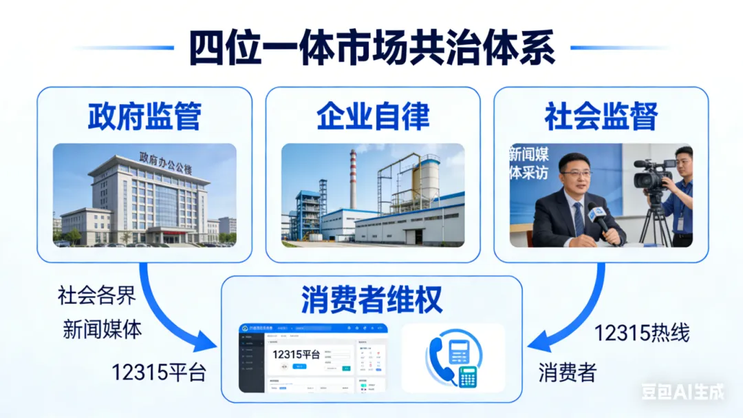 文件明确鼓励社会各界、新闻媒体加强社会监督和舆论监督,同时畅通全国 12315 平台和 12315 热线的举报渠道,引导消费者参与市场监督,构建了 “政府监管 + 企业自律 + 社会监督 + 消费者维权” 的四位一体共治体系。