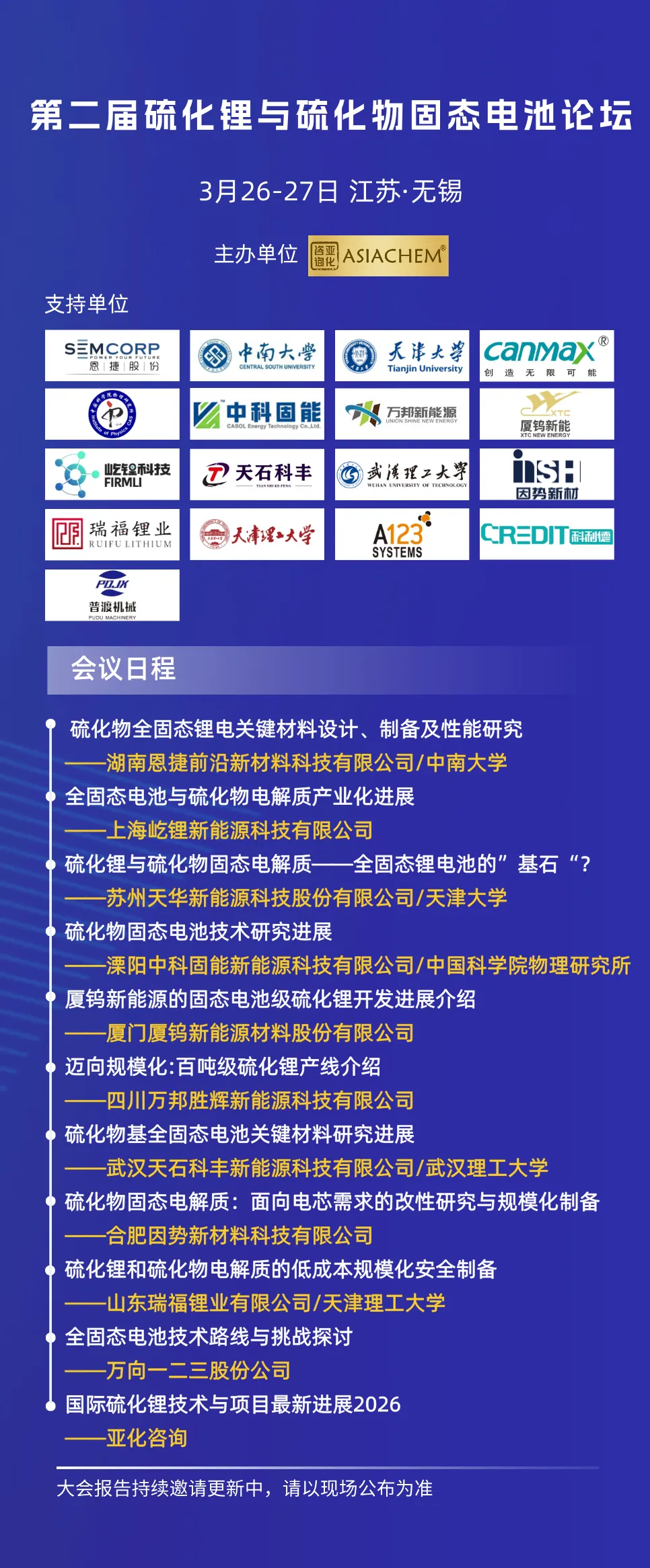 第二届硫化锂与硫化物固态电池论坛将于3月26-27日在无锡召开。湖南恩捷/中南大学、屹锂科技、天华新能/天津大学、中科固能/中科院物理所、厦钨新能、万邦新能源、天石科丰/武汉理工大学、因势新材、瑞福锂业/天津理工、万向一二三、亚化咨询等单位的专家将作演讲,分享硫化锂技术、市场、项目、硫化物固态电解质,固态电池应用与国际动态等议题