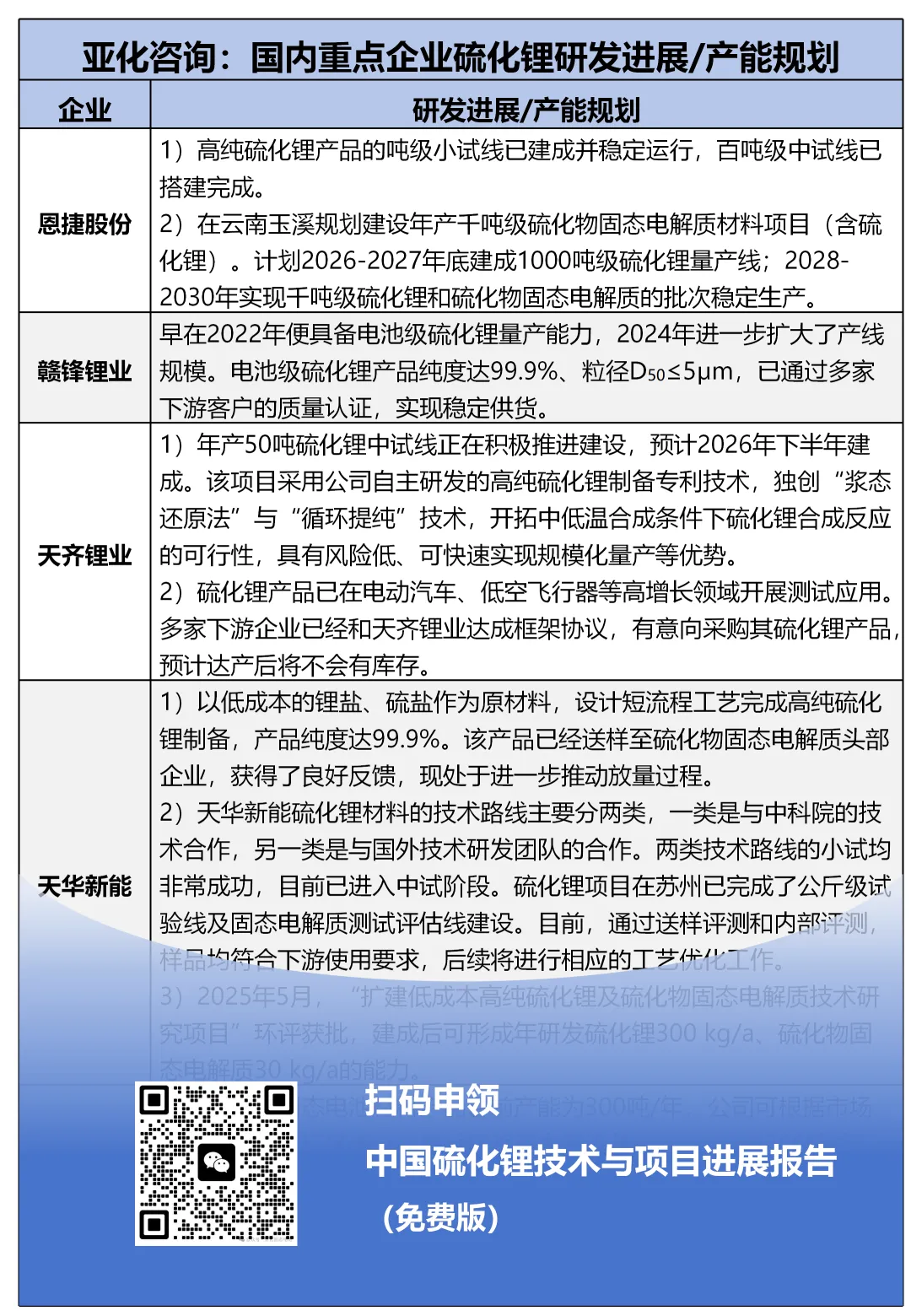 亚化咨询推出《中国硫化锂技术与项目进展报告2026(免费版)》,该报告包含国内外硫化锂技术进展、重点生产企业技术路线/产能/项目最新动态、中国硫化锂/硫化物固态电解质项目数据库、市场分析等。