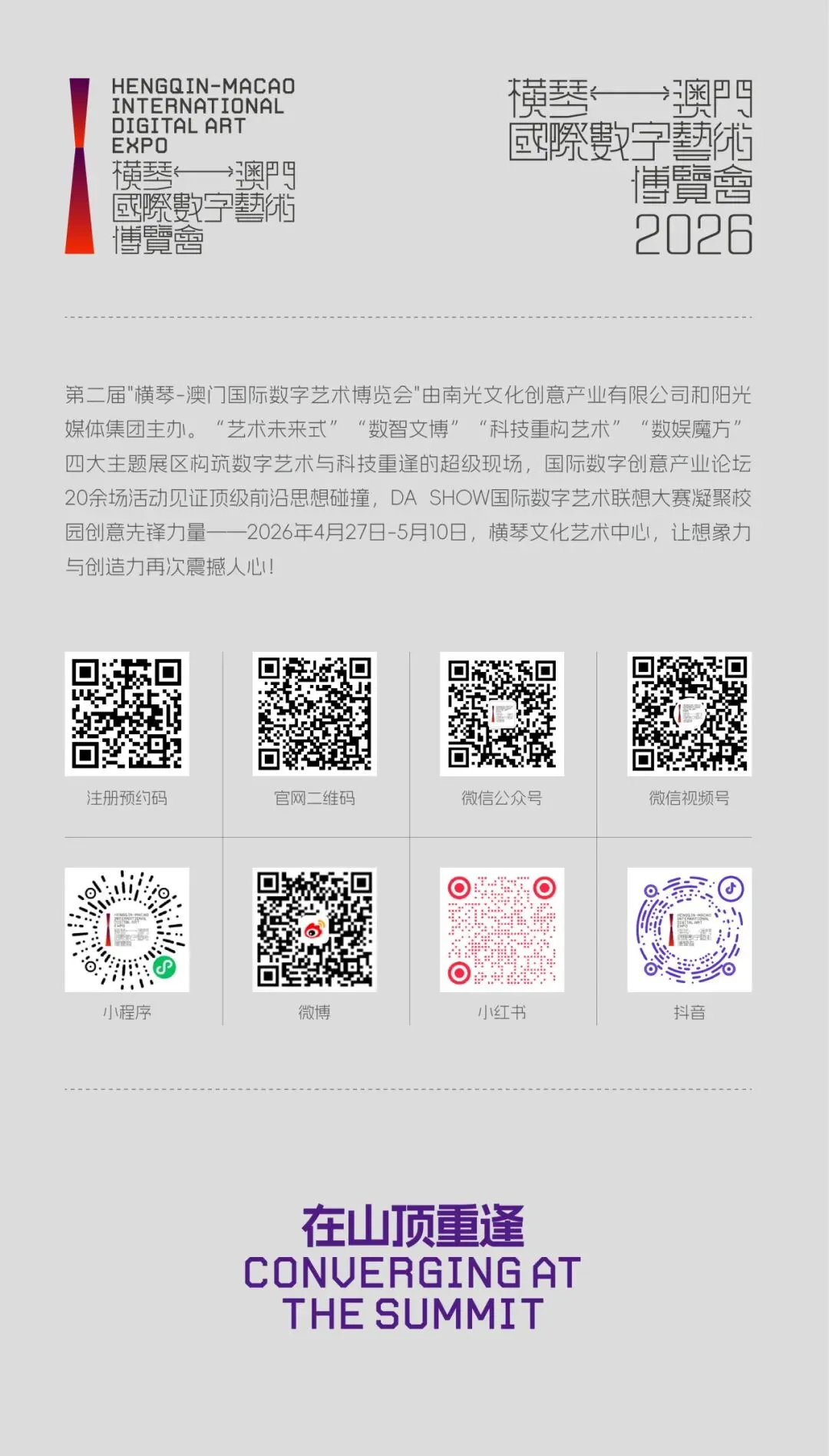2026横琴-澳门国际数字艺术博览会日期:2026年4月27日 - 5月10日地点:横琴文化艺术中心