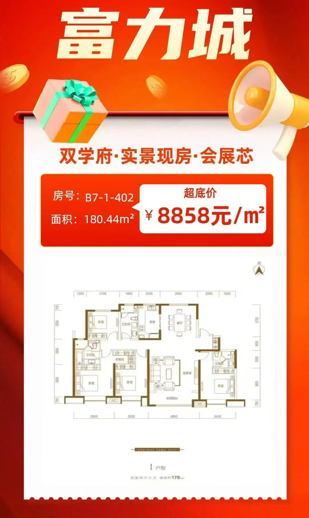改善四室三卫户型单价:8858元/㎡