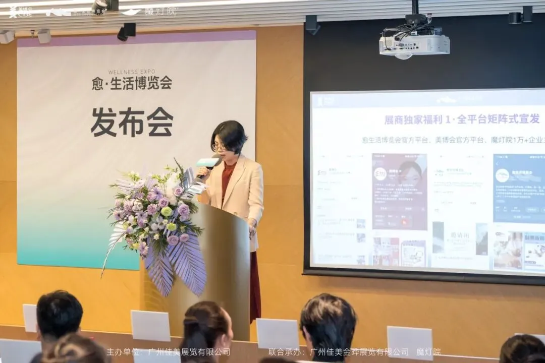 联合承办方代表、魔灯院联合创办人梁敏菲女士详细介绍了愈生活博览会的核心规划,包括精准买家构成、系统招商策略及核心展商权益,并同步宣布“愈生活”小程序正式上线及《愈生活消费指南》商家征集启动。