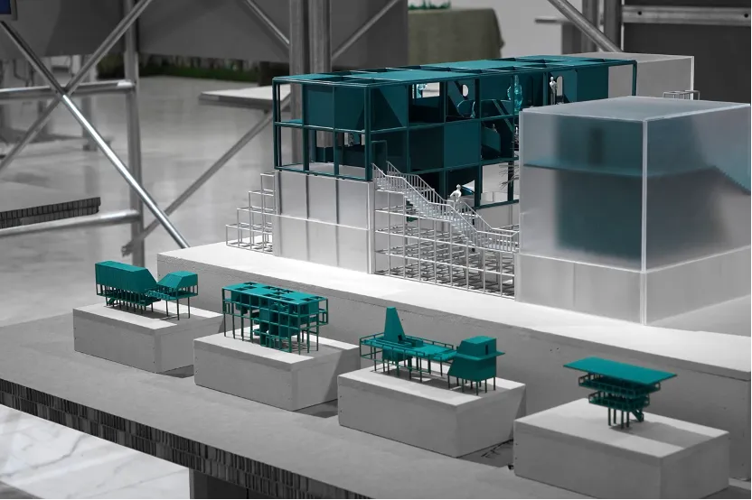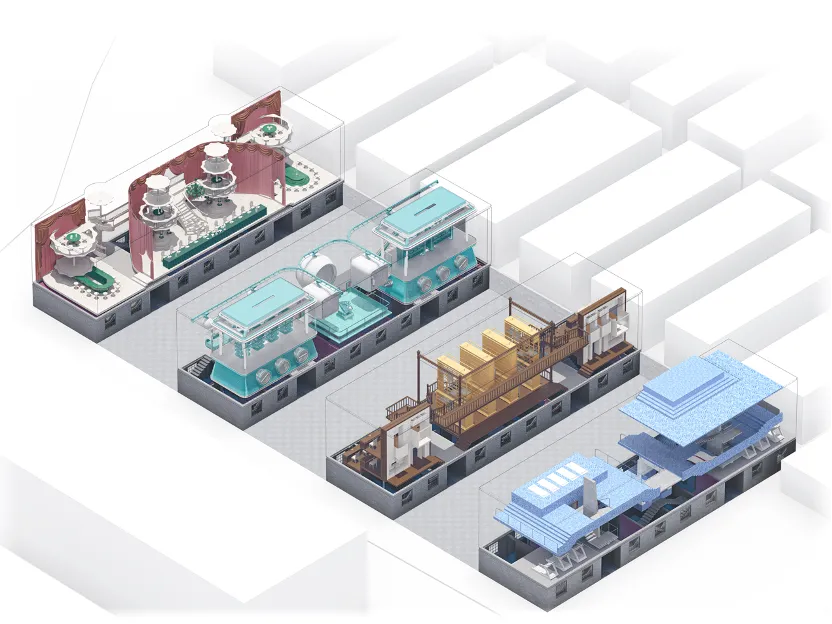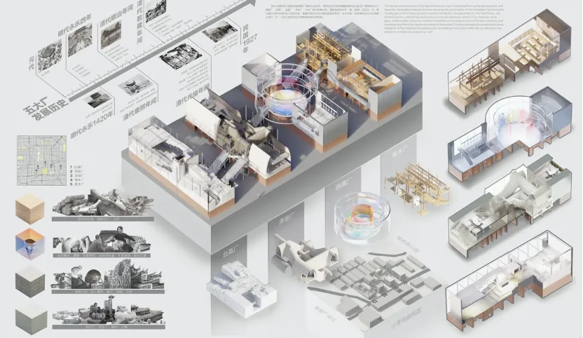 作品简介:以陶然亭公园附近的黑窑厂遗址为出发点,将明代永乐年间修建故宫所设立的五个建筑材料工厂:黑窑厂、琉璃厂、台基厂、神木厂、大木厂做为叙事文本,提取出四种材料:砖、玻璃、汉白玉、木,再以展示四种材料的加工流程为主,根据中国古代对于建筑营造材料的“五材并举”的思想观念与文化隐喻、以及以“土”为中心的材料五行思想来转译形成空间。