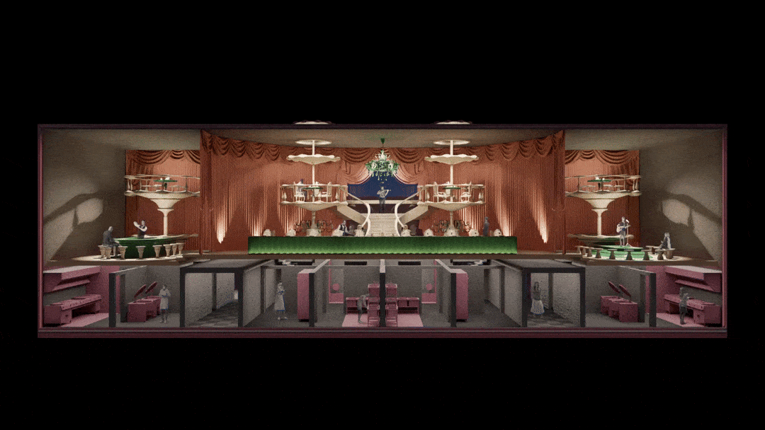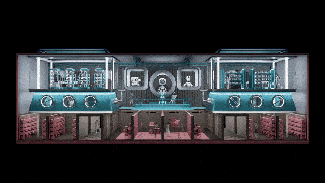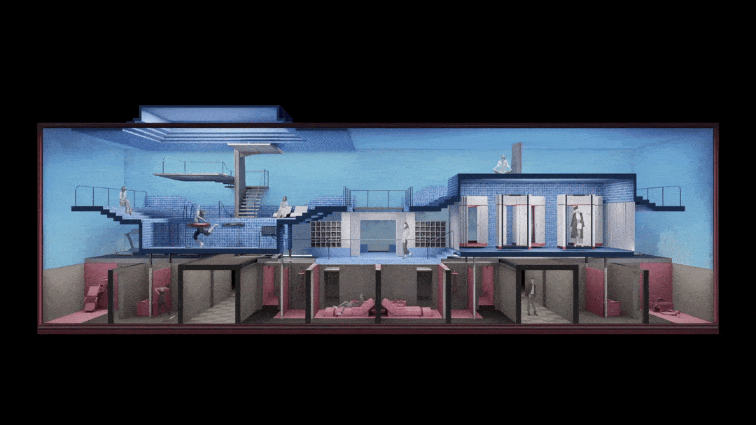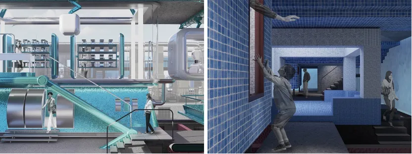 作品简介:在传播媒介快速发展的时代背景下,空间成为内容的载体。设计以真人秀为空间原型,以价值塑造为概念,将建筑的二三层看作整体的情境橱窗,让消费者在参与中被编码为“消费演员”。当人们在社交橱窗涂裱现实身份、对起居橱窗祈求物质头彩、于学识橱窗倒卖认知焦虑、向健康橱窗进献美丽标本时,空间悄然完成了对荒诞的揭露。