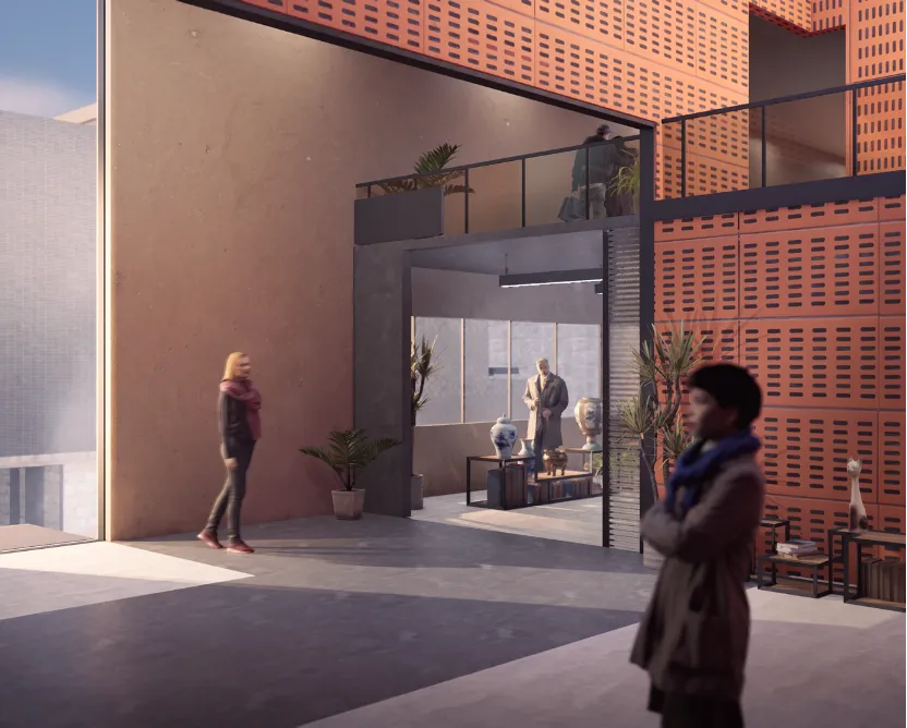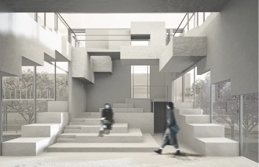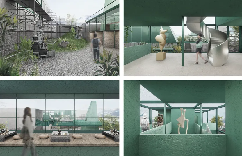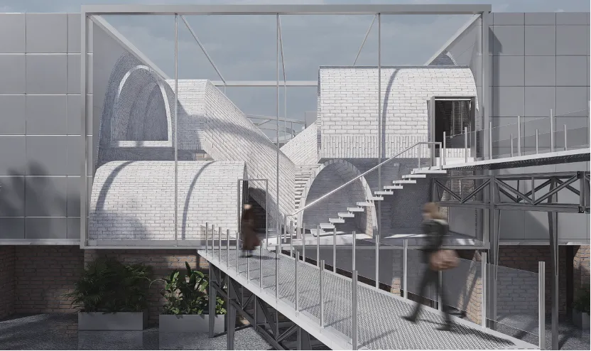 作品简介:《巧筑间》以鲁班锁的结构为原型,学习鲁班锁的榫卯咬合结构,将结构放大千倍作为建筑空间。通过拆卸墙壁、空中搭桥等设计实现空间重组与再创造,将陶然亭公园旁旧建筑改造为一个国潮工坊和传统器物展览馆。设计运用现代材料和空间表现手法演绎传统的构造智慧,让建筑本身成为巨型的榫卯装置,诠释传统工艺与当代空间的共生关系。
