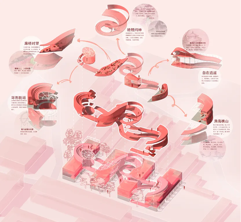 作品简介:在数字化生存的挤压中,人们亟需一个剥离现实重力的逃逸之所,正如古时的雅集。本设计从场地出发,基于陶然亭公园“亭”文化与陶然亭“雅集”文脉,借由《西园雅集图》进行场景转译,同时将亭作为空间原型,构建“五亭逃逸体系”。旨在打造一个可供人们寻求心灵逃逸的新雅集,重塑陶然亭城市山林之景。