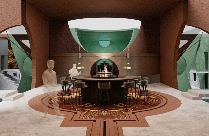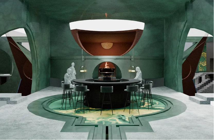 作品简介:设计构建一个哲学性的艺术场域,打破空间的物理边界,呈现一种相互交织的视觉体验。以阴阳为基础构建单元空间语言,通过建筑与镜面的关系,打破单元空间的界限并形成一个整体。设计中心装置作为联通空间与感官的媒介。引导人们感知抽象与现实、分裂与融合之间的关系。