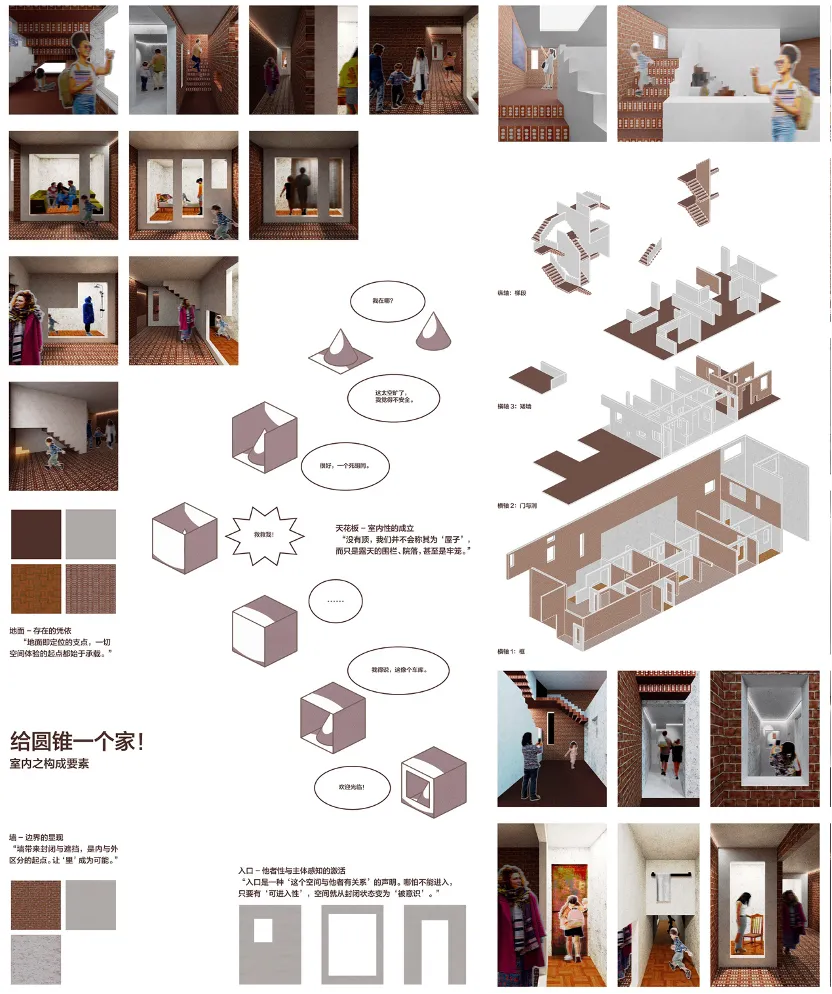 作品简介:本设计在不赋予旧建筑历史叙事的前提下,借助存在主义与现象学理论,打造一个以身体感知为核心的空间体验场。建筑空间本身作为展品呈现,观众以“探险者”的身份进入,在路径、光线与结构的引导下,经历“探索—跃升—迷失—凝望”的空间环节。通过人与环境之间的在场关系,逐渐生成空间意义,构建出可被体验的存在现场。
