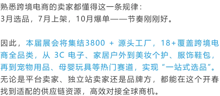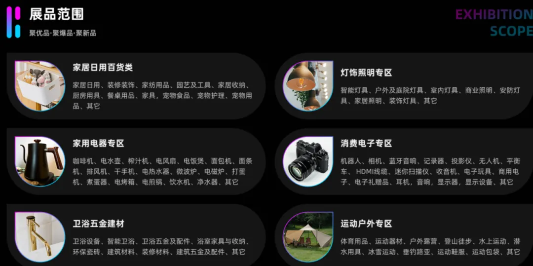 本届展会面积10万㎡,覆盖涵盖跨境电商主流15+品类及8大产业馆,3000+工厂品牌直供选品。