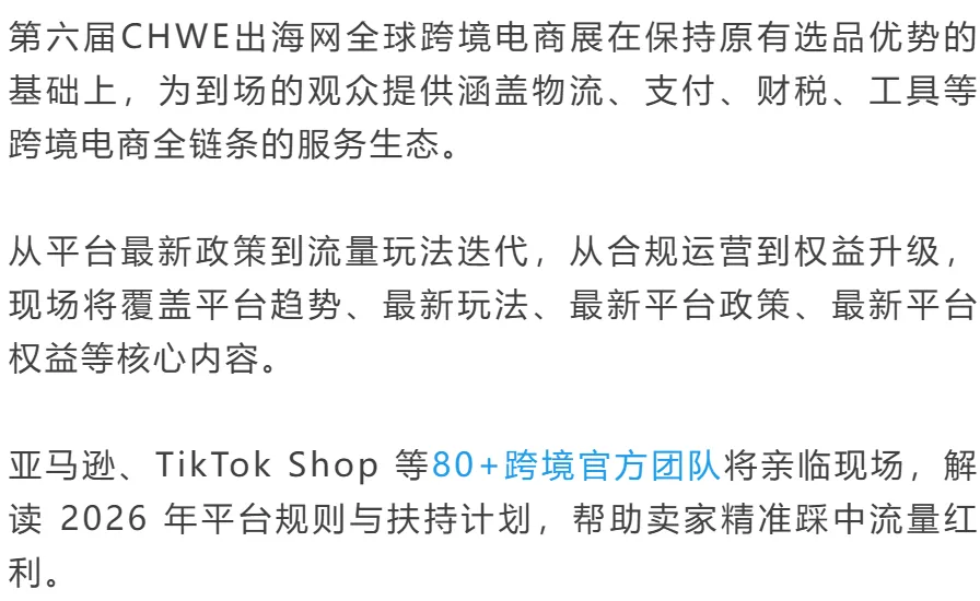 第六届CHWE出海网全球跨境电商展(深圳)春季,将于2026年3月30日-4月1日在深圳会展中心(福田)盛大开启!