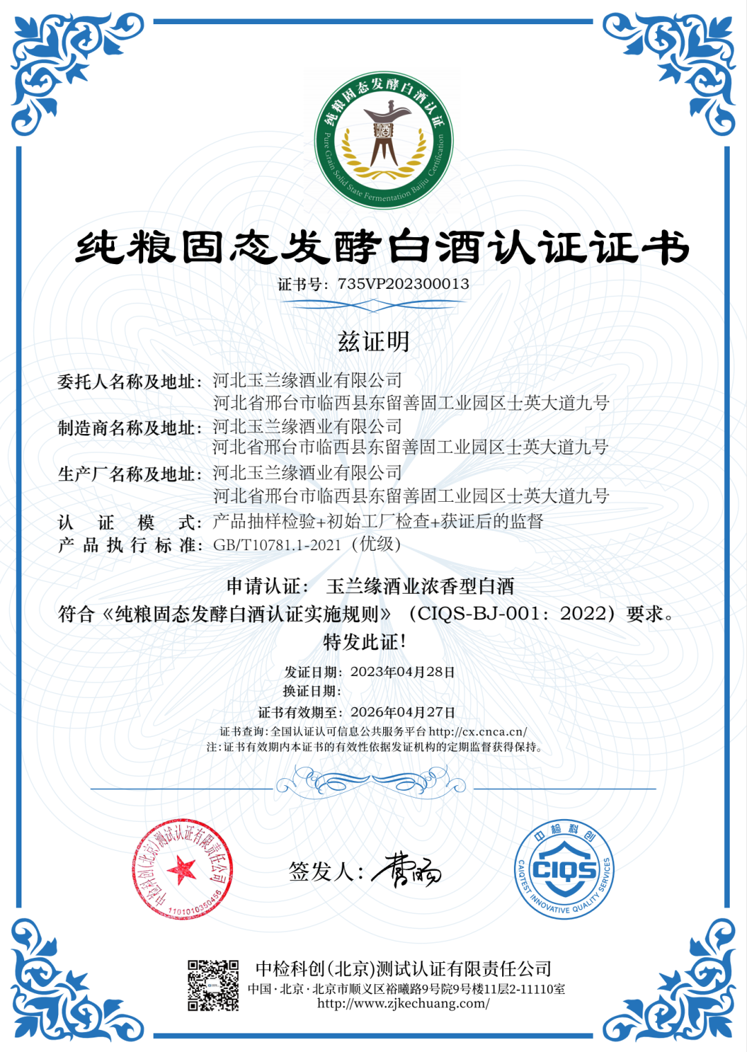 河北玉兰缘酒业有限公司生产的白酒满足白酒纯粮品质要求,符合《纯粮固态发酵白酒认证实施规则》,通过纯粮固态发酵白酒认证。