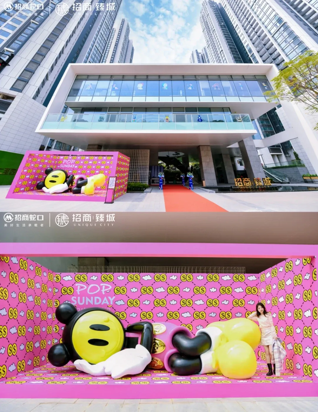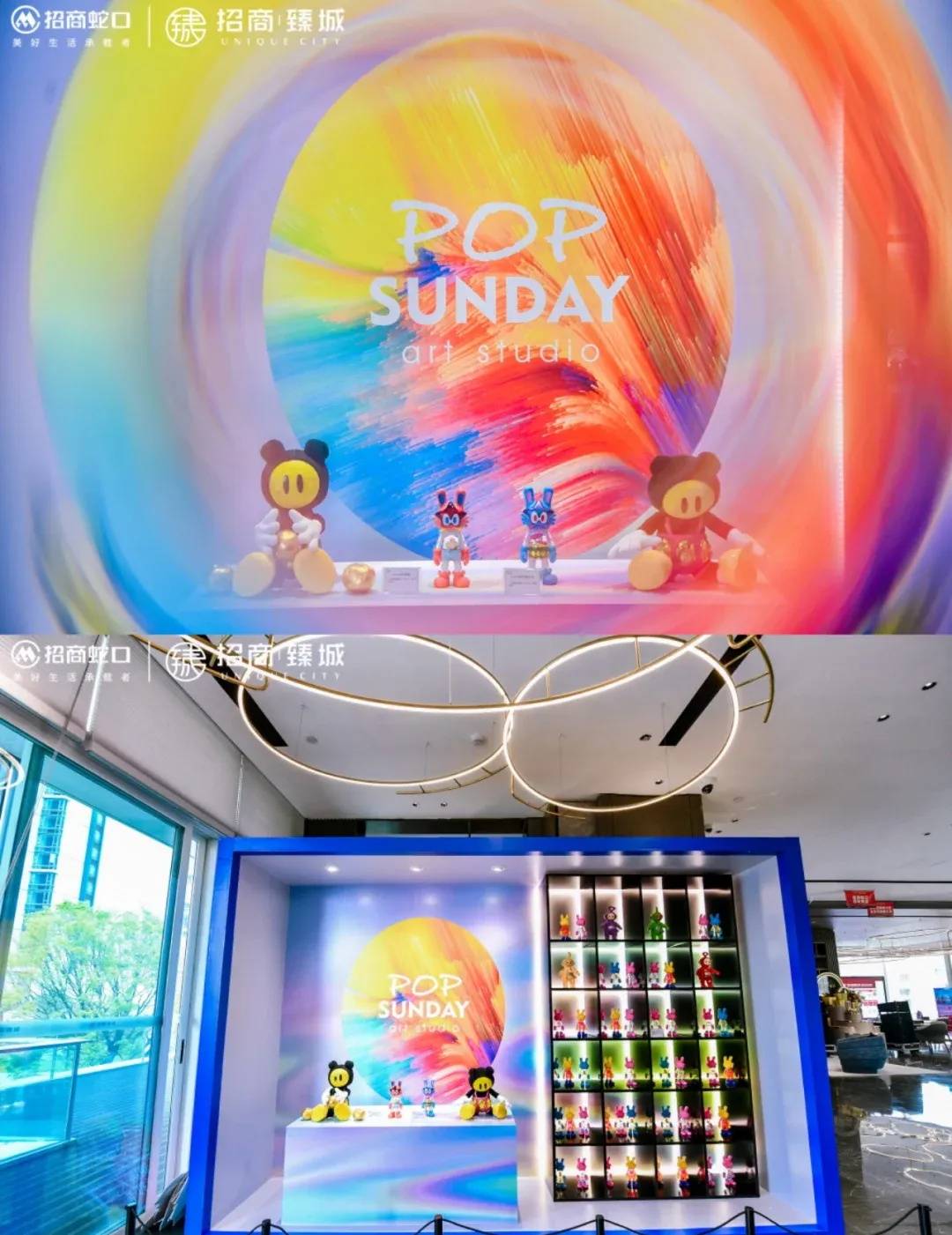 POP SUNDAY联动招商臻城举办限时沉浸式潮玩艺术展,巨型WONEY有钱仔重磅亮相,现场汇集WONEY有钱仔、阿罗汉、忍者神龟、天线宝宝等超100件潮玩艺术品,打造跨界艺术体验。