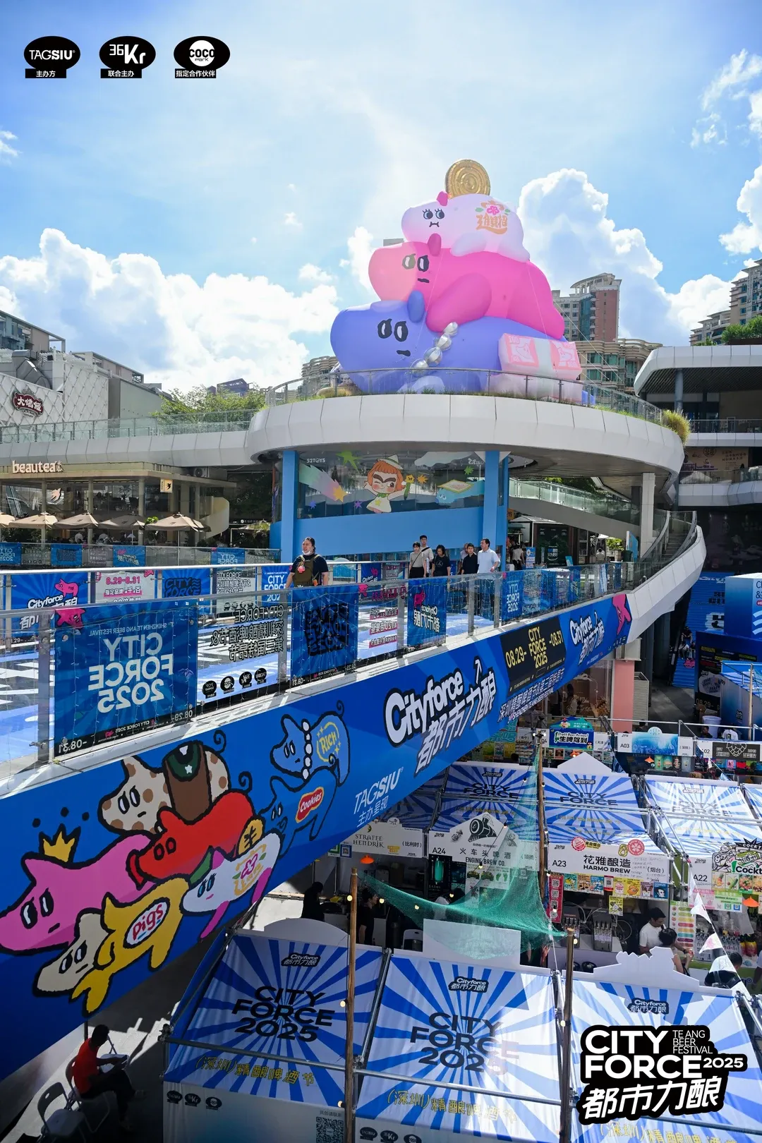 2025年深圳精酿啤酒节在福田Coco Park B1中庭开幕,POP SUNDAY旗下IP猪宝农场作为官方合作IP亮相现场,设置超大气模打卡点,并推出贴纸、抽签等互动环节,进一步提升品牌曝光与现场氛围。