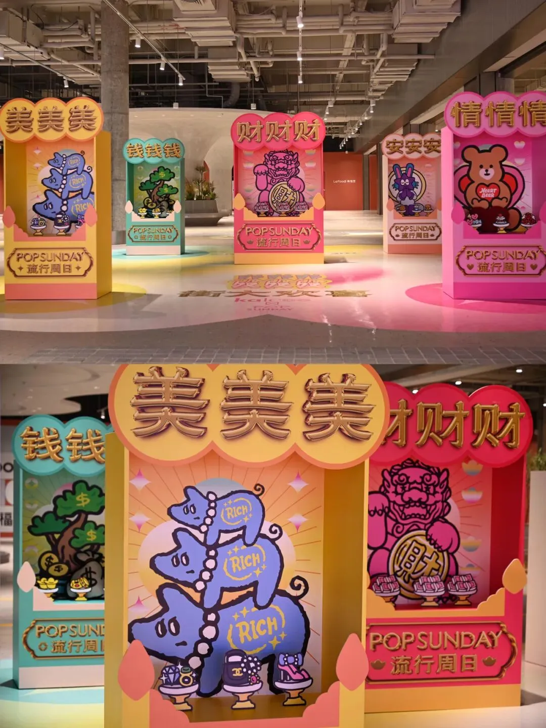 POP SUNDAY登陆深圳嘉乐道,以潮流创意点亮传统年俗,融入品牌热门IP形象,并开设钱、财、美、安、情新春主题展,市民可抽取专属新年签,每一支皆是上上签。