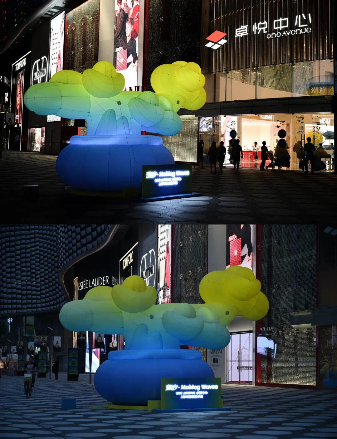卓悦中心迎来五周年,联合POP SUNDAY推出「潮汐・making waves」艺术展。展览以黄蓝渐变撞色打造水墨潮汐视觉,融合中式庭院内涵与潮流个性,现场呈现摇钱树、阿罗汉、招财大猫等 IP 艺术装置,多点位分布可供观赏打卡。