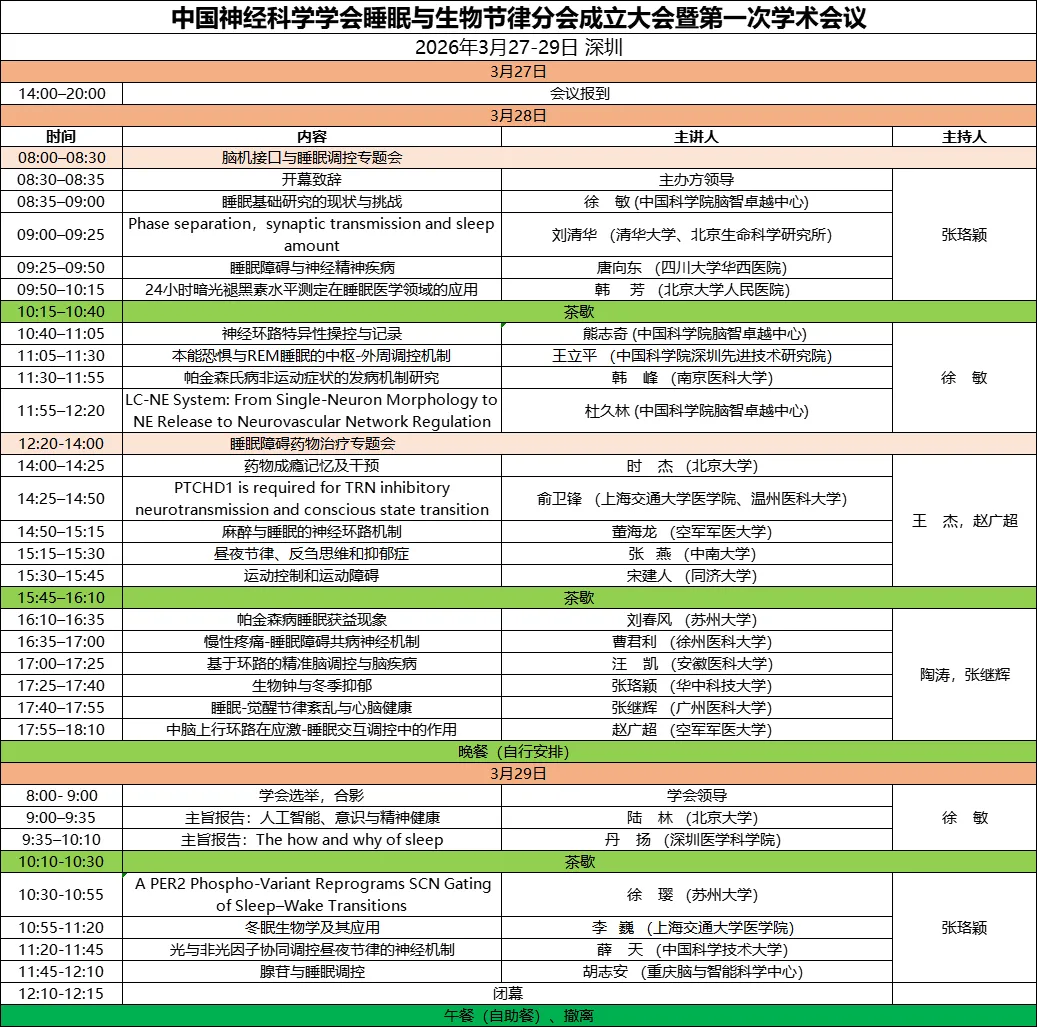 睡眠与生物节律是维系人体生理稳态、调控神经功能与代谢平衡的核心生命过程,不仅深刻影响认知能力、情绪调节与免疫防御,更与神经系统疾病、代谢综合征、心血管疾病等重大慢病的发生发展密切相关;同时,其相关研究是解码生命活动调控机制的关键突破口,对推动神经科学前沿创新、优化健康管理策略、研发精准干预技术具有不可替代的战略意义。另一方面,睡眠与生物节律领域是神经科学与大健康产业融合发展的核心赛道,涵盖睡眠监测设备、智能干预产品、营养健康产品、医疗诊疗设备等多个细分领域,市场潜力巨大。为凝聚全国睡眠与生物节律领域的科研力量,搭建高水平学术交流平台,推动学科发展与成果转化,经中国神经科学学会批准,兹定于2026年3月27日-29日在深圳召开中国神经科学学会睡眠与生物节律分会成立大会。
