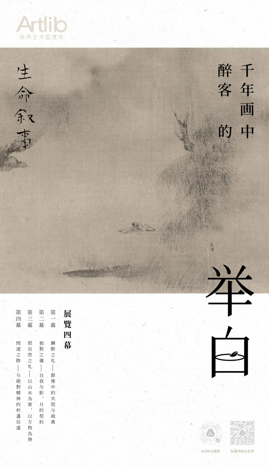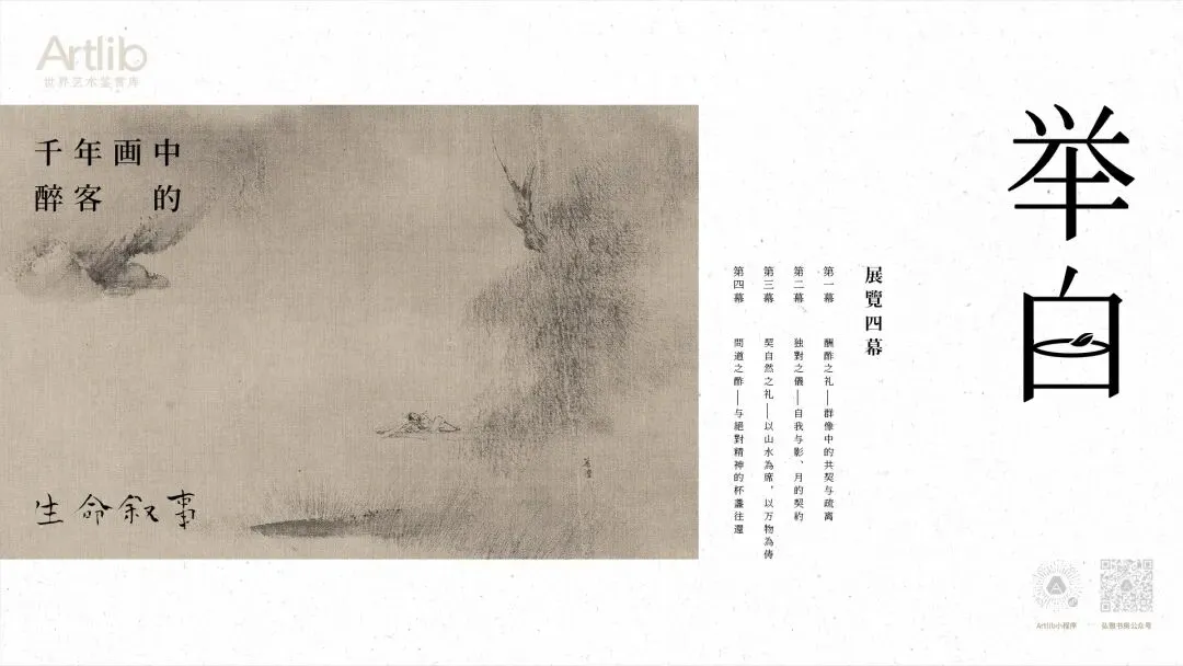 本展览题为 “举白” 。“白”者,酒盏也。我们试图凝视这古往今来无数次重复的“举白”瞬间,循其清响,进入四个层次的世界:从礼制规训下的 “醉里繁华客” ,到自我对峙时的 “醉中独醒人” ,再至物我两忘的 “醉与天地共” ,最终抵达精神超然的 “醉寄有无间” 。