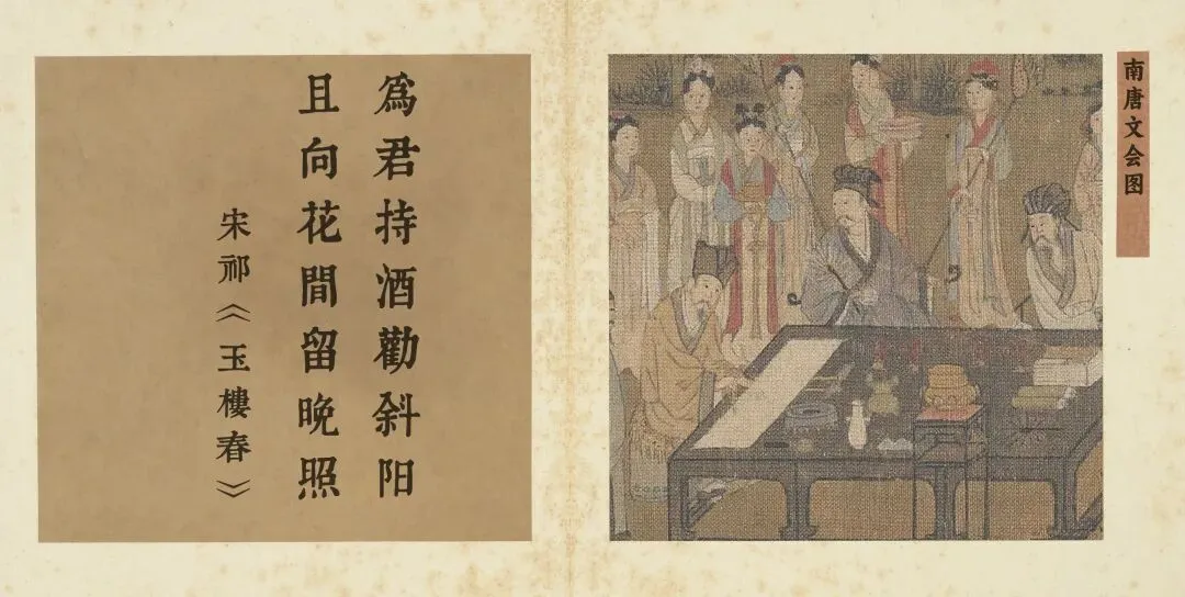 赵昌(传)《南唐文会图》以视觉诗篇,呼应了宋祁“为君持酒劝斜阳,且向花间留晚照”中那份对良辰的深情挽留。画中并非真有人举杯向落日,而是整个雅集场景本身,便构成了一曲对流转光阴的集体礼赞。