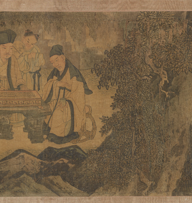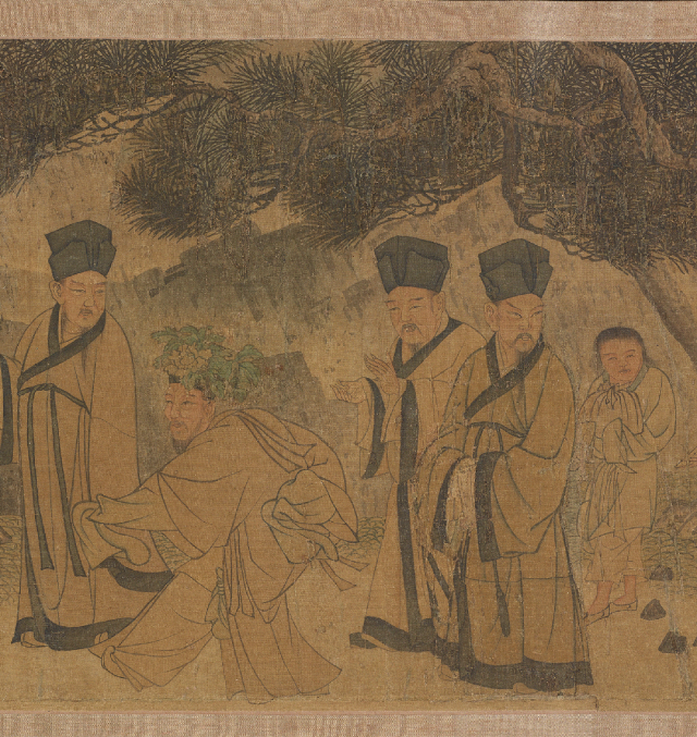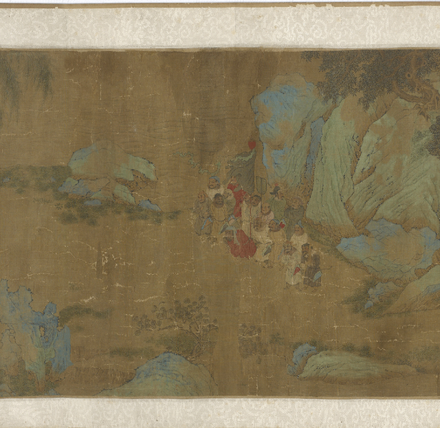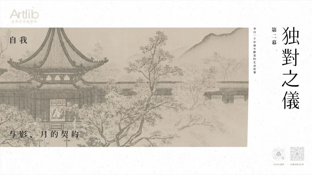 杯盏在此间成为才思流转的媒介,而微微醉意则如春风,柔和地松动了宴饮初期的端肃礼法,让坐姿更为闲适,让神情越发投入。画家更以精妙构图,将玲珑的宴饮场景置于浩瀚的远山与夜幕之下,从而把这场庭院内的欢聚,升华至“光阴者百代之过客”的哲学高度。