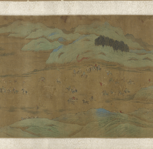 画中严整的唐军仪仗与奔腾的突厥马队,构成了动态的礼仪性构图。这盛大阵仗本身,便是一场凝固的、仪式化的“舞蹈”,彰显着帝国威严,成为会盟这一“不战而胜”时刻最庄重的庆典。仇英以此画卷,将刀兵交锋转化为气势与谋略的博弈,使观者感受到一种超越战场喧腾、沉潜于历史深处的、更为醇厚与恢弘的胜利醉意。