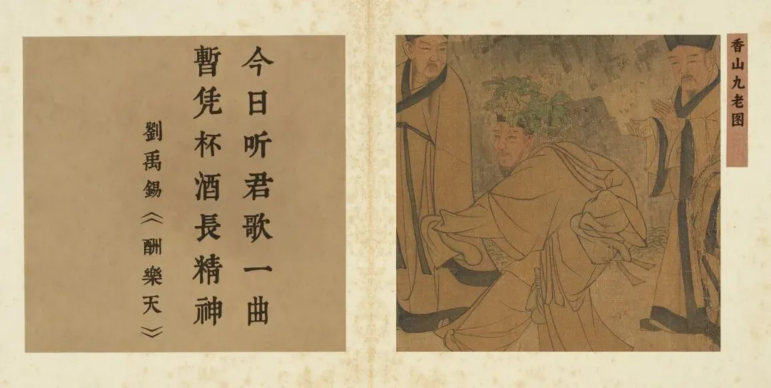 马兴祖的《香山九老图》以静谧悠远的笔触,完美诠释了刘禹锡“暂凭杯酒长精神”的深意。画中白居易等九位耆老齐聚林泉,他们的聚会并非喧闹宴饮,而是围绕展卷品读、弈棋清谈展开。这一场景,恰是“听君歌一曲”的视觉化呈现——彼此智慧的交流与诗文的唱和,如同无声的歌曲,滋养着彼此的心神。