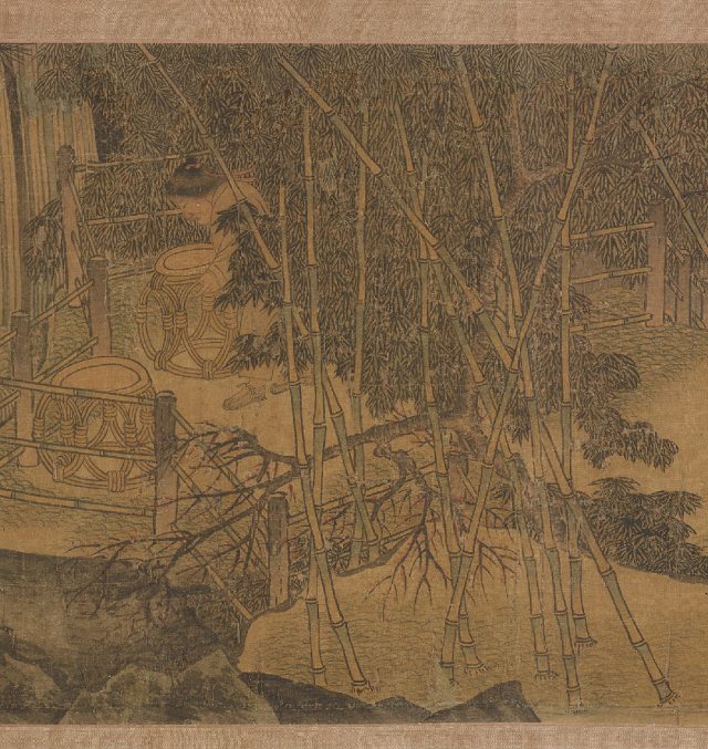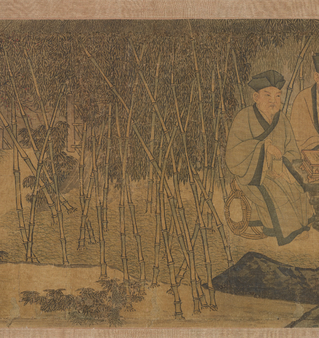 文士们齐聚于花树庭院,或展卷品评,或扶案凝思,或相顾畅谈。他们的沉浸与欢愉,在温润的笔墨与和谐的布局中流淌。这闲适而风雅的聚会,其存在的每一刻,都是对易逝春光的郑重“挽留”。画幅上方,芭蕉、竹林俯仰生姿,与人物活动融为一体,自然构成了“竹间晚照”的永恒布景。斜阳虽未现于画面,但其温暖、宁静、略带感伤的光辉,仿佛弥漫在每一片叶梢与每一袭衣袍之上。