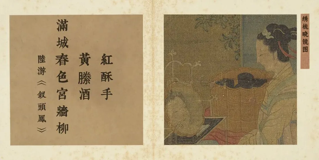 王诜的《绣栊晓镜图》虽绘闺阁晨妆,但其私密、静观与内省的场景,恰恰可视作陆游“红酥手,黄縢酒。”爱情记忆的永恒定格与内化仪式。画中女子对镜自照,这一动作本身便是一种深刻的自我凝视与构建。她身旁的妆奁器物,如同那杯无法共饮的“黄縢酒”,已从现实的欢宴道具,转化为追忆中自我对话的静默媒介。