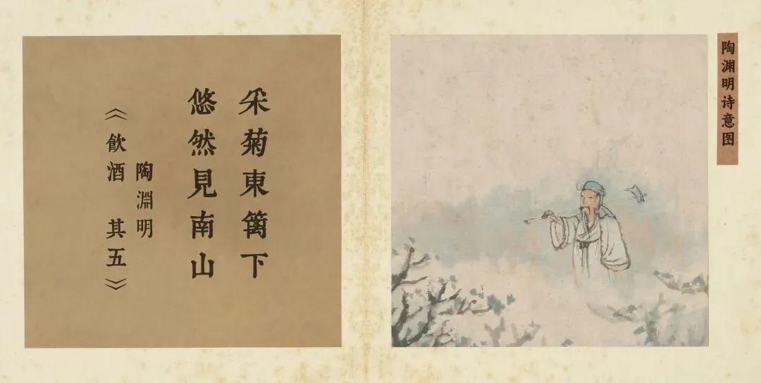 石涛的《陶渊明诗意图册》以水墨淋漓的笔意,完美捕捉了“采菊东篱下,悠然见南山”中那份物我两忘的仪式神韵。画中,诗人躬身采菊的动作,绝非寻常劳作,而是一场以自然为圣殿、以身心为祭器的静穆。他的姿态舒缓而专注,仿佛整个宇宙的节奏都凝聚于这俯仰之间。