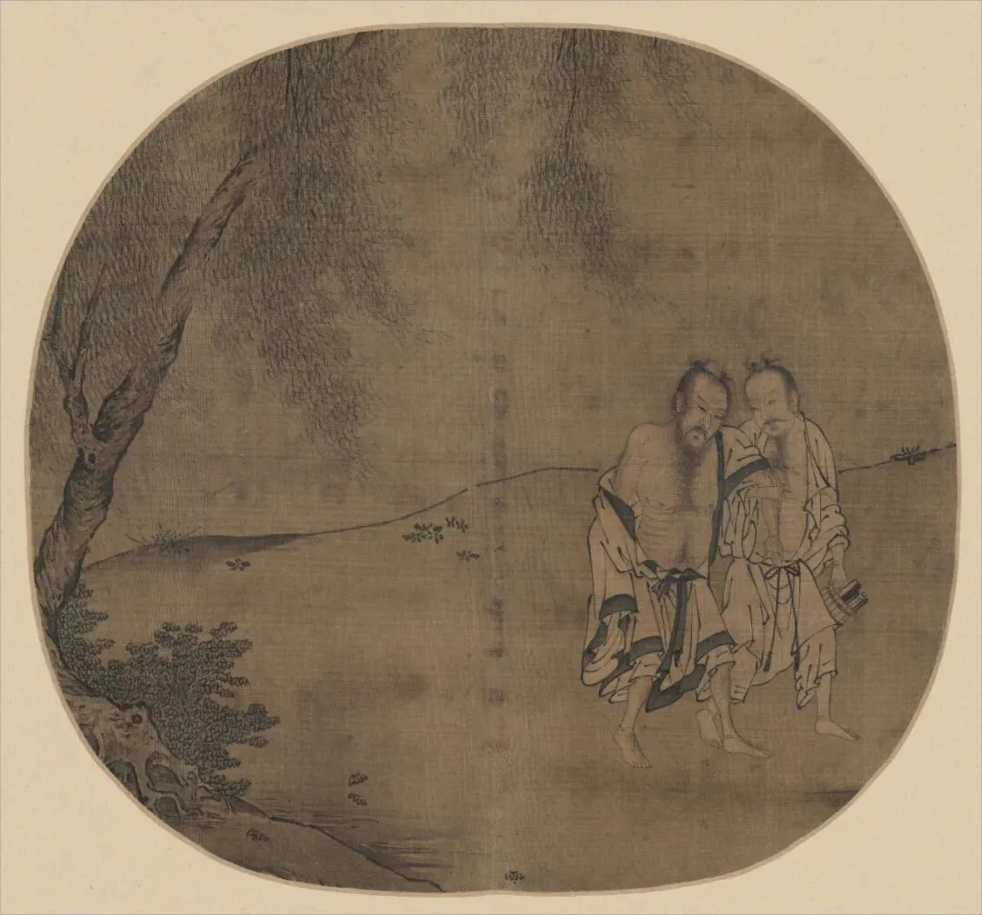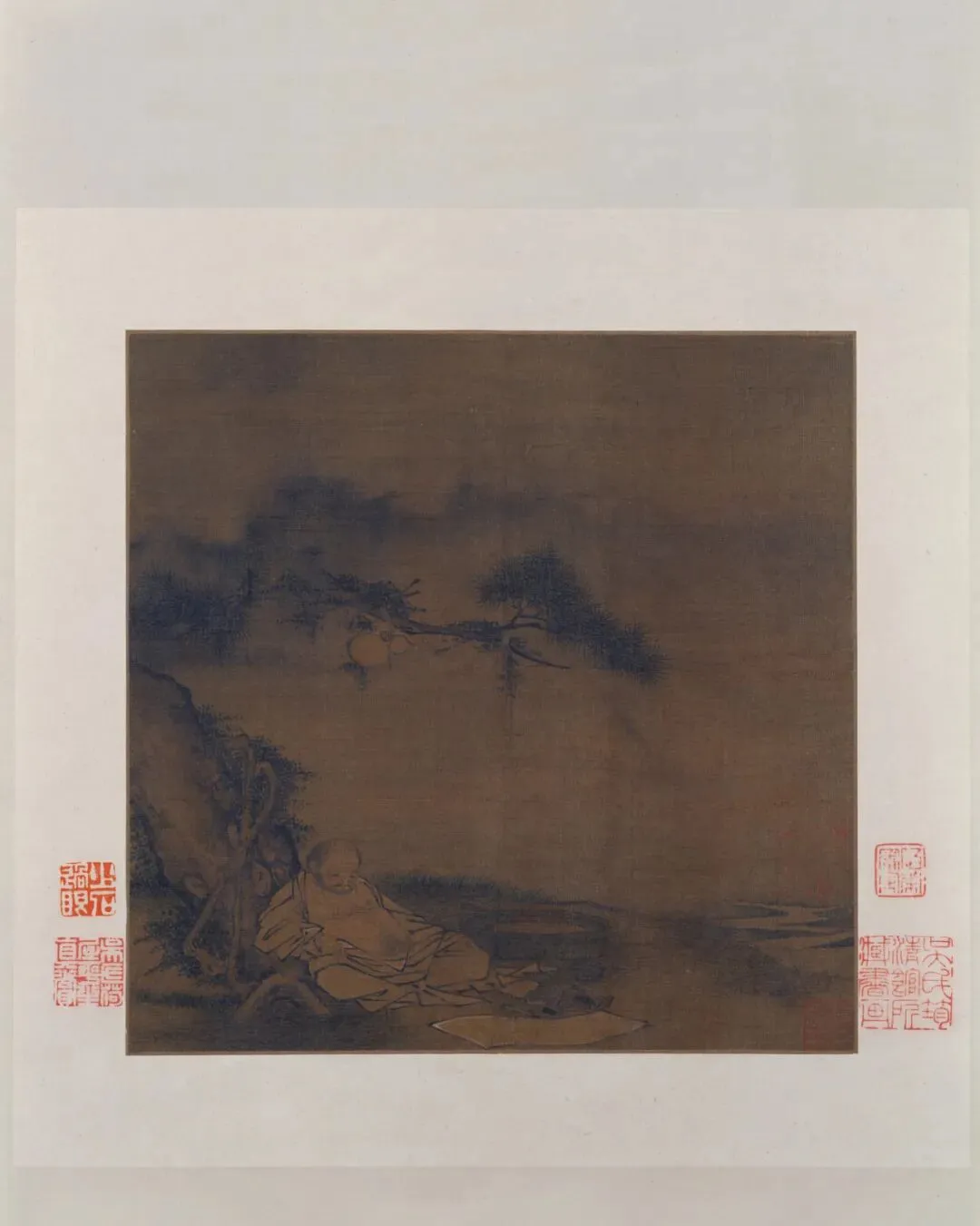 《松下憩寂图页》中,酒葫芦高悬于松枝,树下僧人身躯松弛、敞怀酣然。此景精准捕捉了“一壶酒,一溪云”之意——酒具虽在,却已成点缀;真正的沉醉,全然显现在僧人与自然交融的体态中。他背倚盘根,似睡非睡,纸笔散落一旁,这种对身外之物的漠视与对松干倚靠的依赖,构成了鲜明对比。衣纹用笔如梁楷般凝练质朴,恰好衬托出人物精神的超然。