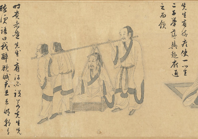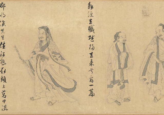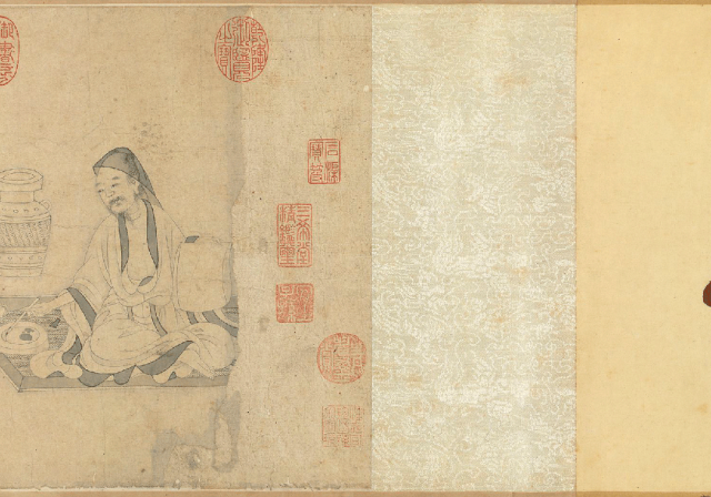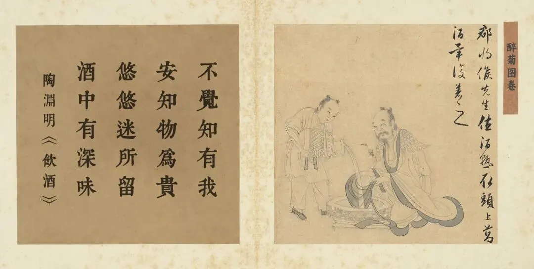 在《醉菊图卷》中,陶渊明与他的“漉酒巾”共同构成了一个深刻的精神隐喻。这位辞官归隐的诗人,其形象已从历史人物升华为“隐逸”与“率真”的文化符号。画中最精妙的一笔,莫过于他头上那方寻常头巾,它关联着“葛巾漉酒”的著名典故:陶渊明曾解下头巾滤酒,用毕又坦然戴回。