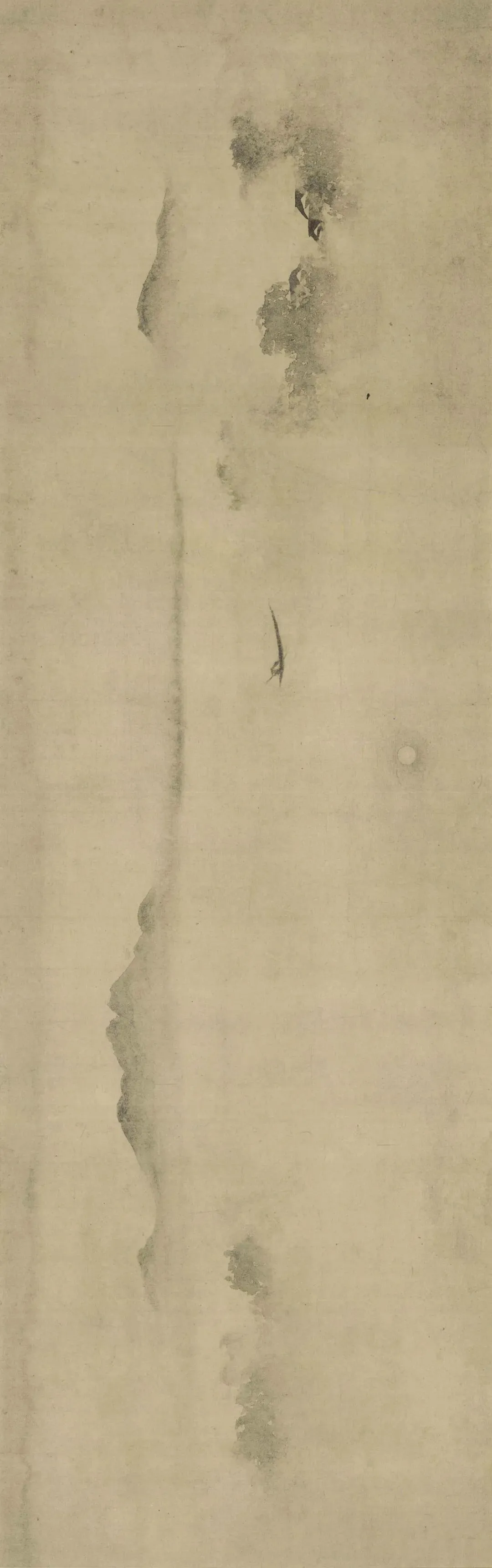 梁楷此画以枯杈垂柳、飞鸦冷月,构筑了一个超越形骸的祭坛。那随风流转的圆弧线条,将整个画面化为浩瀚涌动的酒泉,呼应着“黄河化为酒”的磅礴奇想。观者的视线被卷入枝梢与飞羽的轨迹,仿若精神“抛身入里许”,在幽邃的时空里完成一场无声的醉饮。画中无酒具,却使天地自成仪轨;无醉态亦无笙歌,却让流转的笔墨本身成为了通灵的媒介。