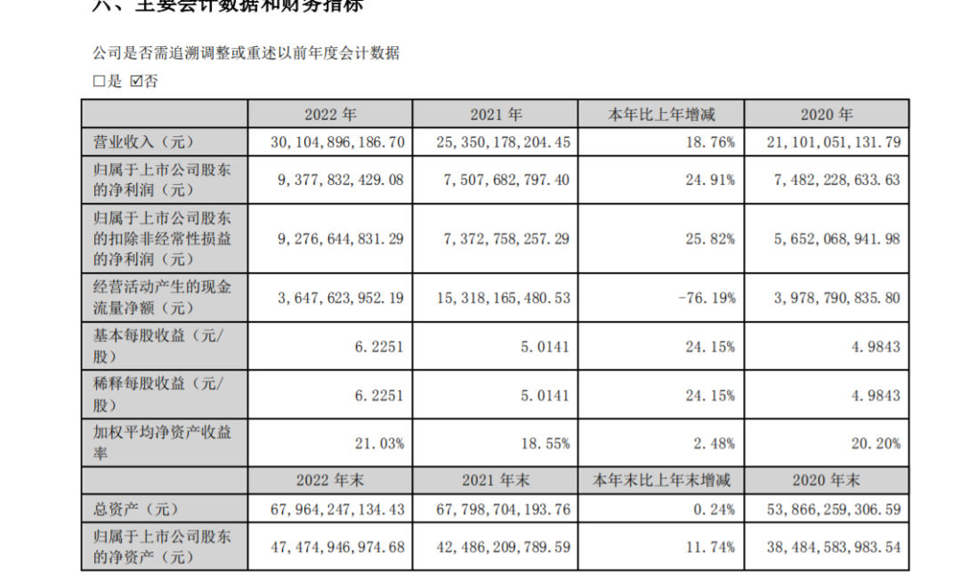 4月25日晚间,洋河股份发布2022年年报,财报显示,2022年洋河全年实现营业收入301.05亿元,再创新高并突破300亿大关,同比增长18.76%,;实现归属于上市公司股东的净利润93.78亿元,同比增长 24.91%。